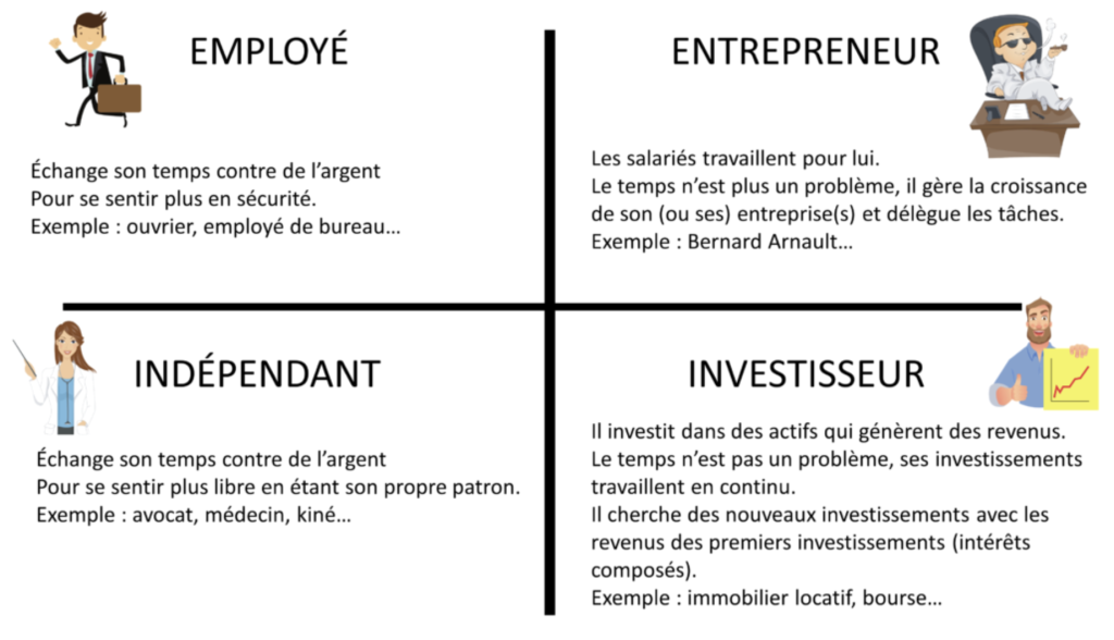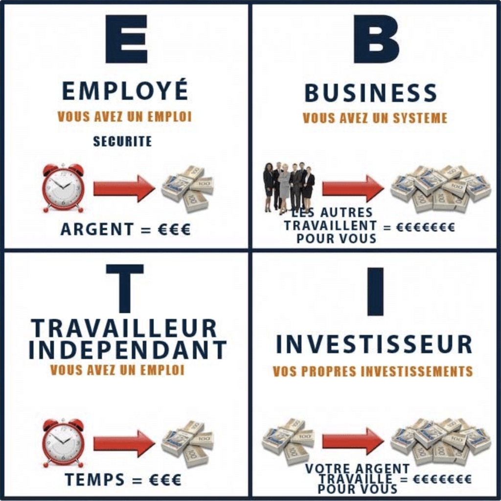 1. Employé : dans ce quadrant, vous travaillez pour quelqu’un d’autre et échangez votre temps contre un salaire fixe. Vous êtes généralement limité en termes de revenus et de liberté financière.